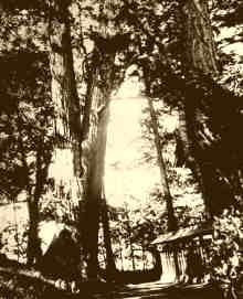 御神木であった大杉は昭和28年11月3日に切り倒されており、現在はその跡が残るのみです。中が空洞化していたこと、また5,6メートルのところより二股に分かれており一方が社殿に倒れる恐れがあったために伐採されました。あまりに太く、またバランスがよかったらしく、綱引き用のロープをかけて大勢の手によりやっとの思いで倒したということです。